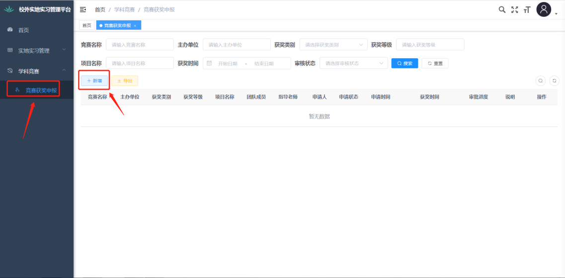 我校在校学生或指导教师通过“北京印刷学院教务处”-“学科竞赛管理平台”-“统一身份认证登录”-“竞赛获奖申报”-“新增”模块进行学科竞赛获奖信息填报,提交后由项目负责人所在学院进行信息审核。填报奖项主要为2022年1月1日以来取得的奖项(以获奖证书中印发时间为准),其中,2022年度取得的奖项请于2023年4月17日前填报完成,2023年以后取得的奖项填报时间不限,可随时进行填报。