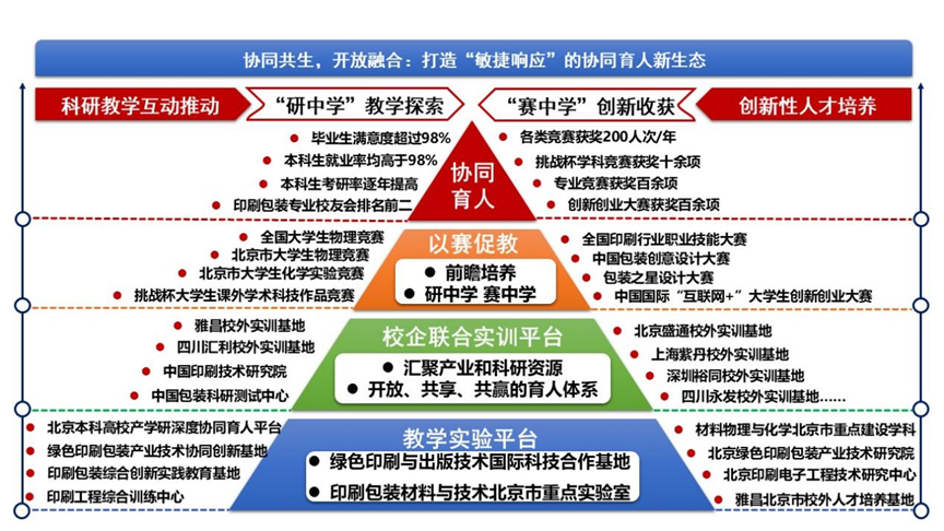 一是建立共建、共管、共享机制。与66家单位组建全国绿色包装行业产教融合共同体,共同制定培养方案以培养高素质复合型工程技术人才,精准对接企业用人之需。二是建立40个校外人才培养基地,与北京雅昌文化发展有限公司共建北京本科高校“产学研”深度协同育人平台,协同国外、兄弟院校和企业资源,实现多方协同育人机制。邀请英国利兹大学、英国利物浦大学教授授课,7名同学到英国利兹大学、德国斯图加特大学交流学习6个月以上。2019年以来,企业实训500人次/年,50名企业导师参与课程讲授、毕业设计和实习指导。三是实施“一生一册”工程实践。开发实习系统,确保指导每位学生高质量实习。2019年以来,5000名学生参观、实习和调研60家印刷包装企业,提升了学生解决复杂问题的能力,适应技术迭代对人才的需求。