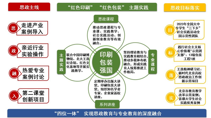 结合行业特色,打造“思政课程-主题实践-专业课程-系列讲座”四位一体的“印刷包装出版大思政”育人品牌。一是创新推出《大国出版》思政公开课,发挥党建引领,以“红色印刷、红色包装”为主题打造“王选精神研究会”“校友沙龙”“学姐学长话北印”等品牌,通过沉浸式教学涵养家国情怀和行业荣誉感。将公开课作为必修课纳入培养方案,建设7门课程思政示范课,创新开展“马背上的印刷机”等15堂“行走的思政课”。二是深化课程思政内涵,全面修订教学大纲,明确思政目标。建设专业思政案例库,将行业成就、科学家精神有机融入教学。三是开展系列讲座,2019年来,3000多人次本科生与行业专家、产业精英交流互动。学生党支部3次获得北京高校红色“1+1”示范活动优秀奖。“印迹筑梦——奋力打造上海、嘉兴、北京红色印刷路线”获评首都大学生主题社会实践优秀案例。